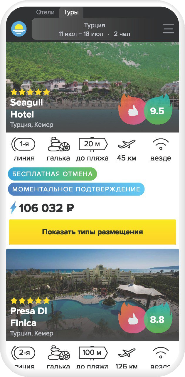 Система распознаёт ваши предпочтения максимально точно и группирует туры по выбранному «впечатлению»: «на море», «в горы» и другие, а также предлагает самые разные варианты проживания, от привычных отелей до колоритных апартаментов